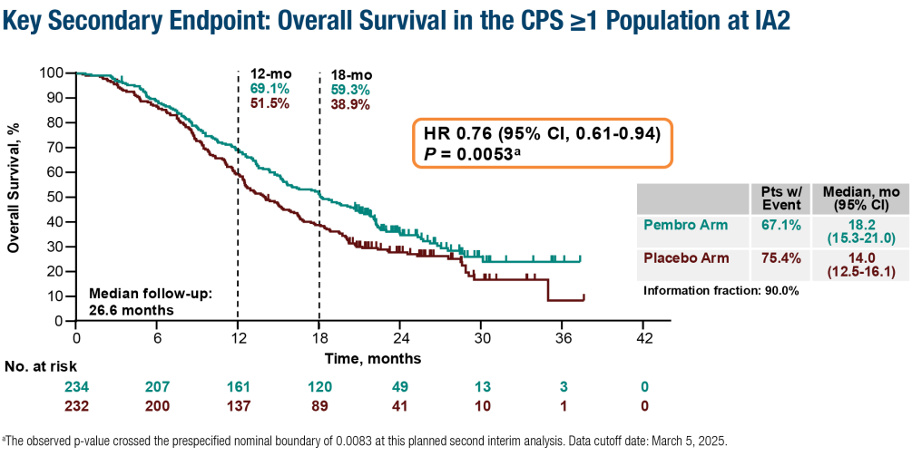 首次中期分析显示,中位随访15.6个月时,意向治疗人群(ITT)的帕博利珠单抗组的mPFS为8.3个月,安慰剂组为6.4个月(HR 0.70,95%CI 0.58-0.84,P<0.0001)。在PD-L1阳性(PD-L1 CPS≥1)人群,帕博利珠单抗组和安慰剂组的mPFS分别为8.3个月和7.2个月(HR 0.72;95%CI 0.58–0.89;P=0.0014)。