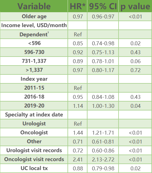 在中国台湾健康保险研究数据库中确定了2011年至2020年期间被诊断为la/mUC的成年患者。索引日期是la/mUC诊断日期。对患者进行随访,直至死亡或2021年底,并分为接受治疗或未接受治疗。诊断后≤12个月接受一线全身治疗的患者被分配到治疗组;一线治疗是使用从第一次处方开始≤30天的全身诊疗药物数据来确定。使用描述性统计。使用多变量Cox比例风险模型(根据年龄、性别、改良Charlson合并症指数和诊断时UC分期进行调整)来检查接受治疗和总体生存率(OS)的指标。