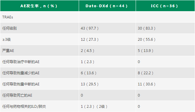 在安全性方面,Dato-DXd相较于对照组(ICC组)在≥3级治疗相关不良事件(TRAE)的发生率上更低(27.3%vs.55.6%),表明其耐受性相较于常规化疗更佳。