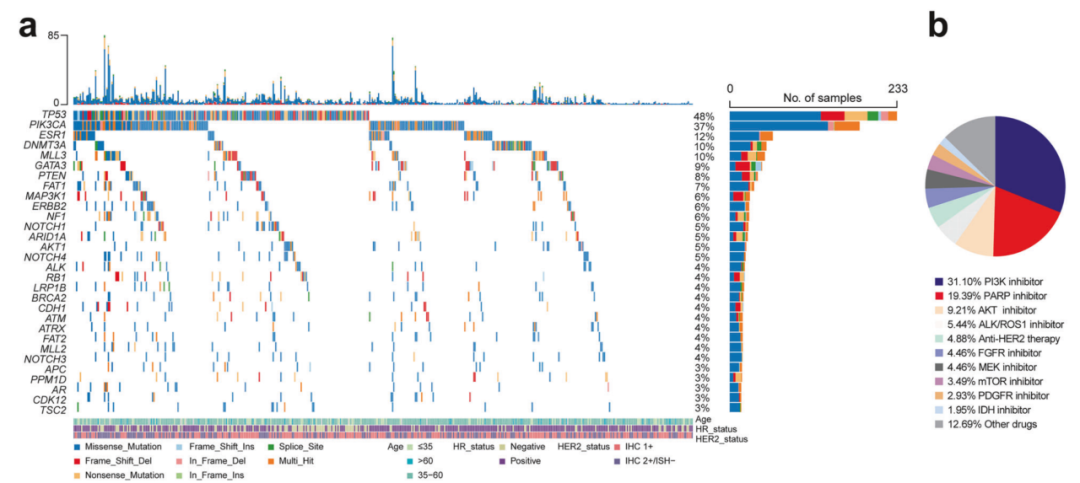 △488例HERHER2-low MBC患者中最常见的30个突变基因的突变特征(a)及其可用药物百分比(b)