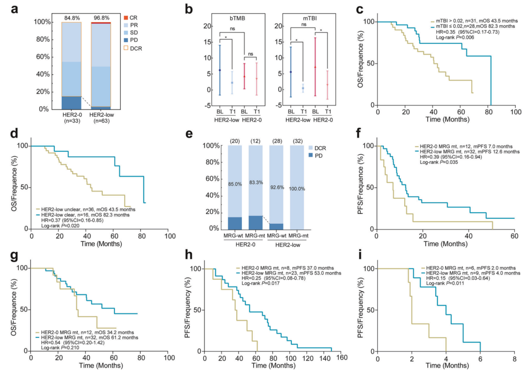 此外,研究还对晚期乳腺癌一线化疗患者进行了ctDNA动态分析,结果显示,HER2-low MBC患者在初始两个治疗周期后分子肿瘤负荷指数(mTBI)降低或ctDNA早期清除的患者显示出更长的总生存期(OS)。结果提示动态分析ctDNA对于预测HER2低表达肿瘤患者的生存有潜在的价值。