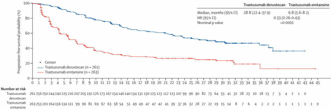 DB-03的研究结果于2021年在ESMO大会上首次公布[1],不仅刷新了当时HER2阳性乳腺癌的临床获益结果,同时也被国际指南纳入,推荐T-DXd为HER2阳性晚期乳腺癌的二线标准治疗。随后在2023年,DB-03研究成果登顶《Lancet》[2],更新的数据显示,T-DXd的无进展生存期(PFS)显著高于T-DM1(28.8个月vs 6.8个月),虽然总生存(OS)未达到,但OS的风险比(HR)为0.64,表明T-DXd存在获益趋势;同时,T-DXd的客观缓解率(ORR)为78.5%,而T-DM1为35%。