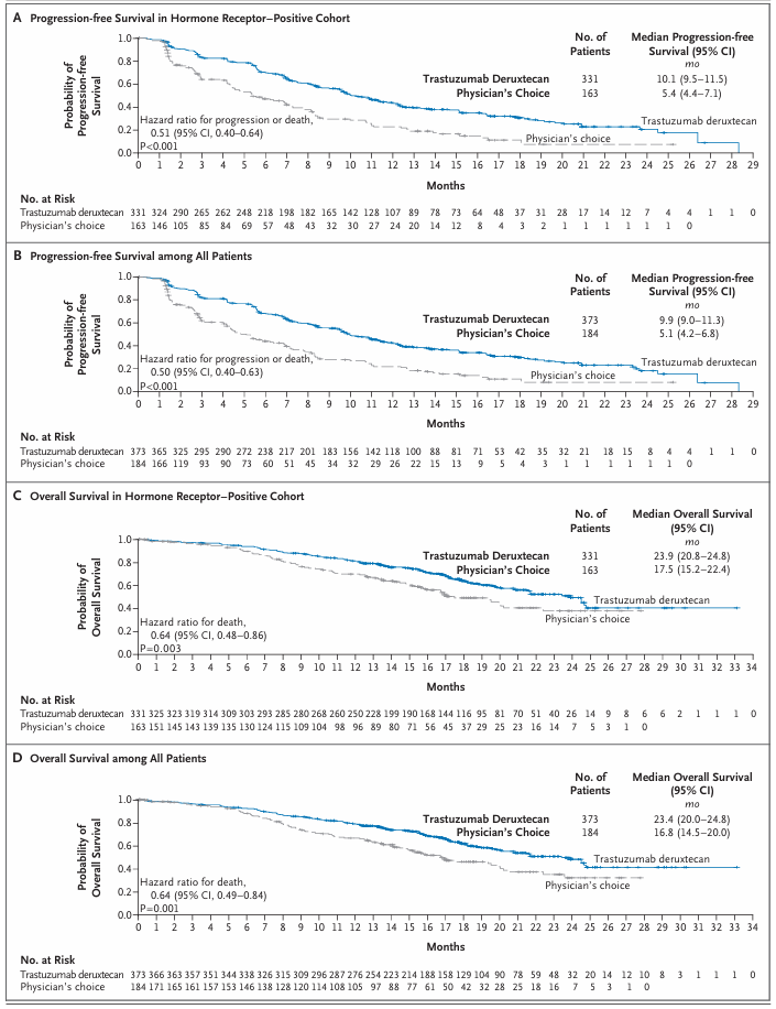 在安全性方面,T-DXd和TPC治疗期间不良事件(TEAEs)的发生率相似(99%vs 98%),但T-DXd治疗的≥3级TEAEs发生率低于TPC治疗(52.6%vs 67.4%)。近期更新的数据显示,T-DXd的总体安全性数据与上述的初步分析结果保持一致,表明更长时间的T-DXd暴露不会增加药物毒性。