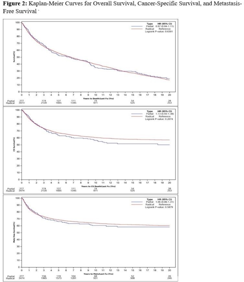 值得注意的是,无论是在部分膀胱切除术之前还是其病理标本中偶然发现的原位癌病史,与膀胱内复发增加无关(HR 0.837,P=0.46)。与根治性膀胱切除术相比,部分膀胱切除术不会影响全身肿瘤的控制,在多变量分析中,二者的无转移生存率(HR 1.06,P=0.59)和肿瘤特异性生存率(HR 1.13,P=0.21)相似。