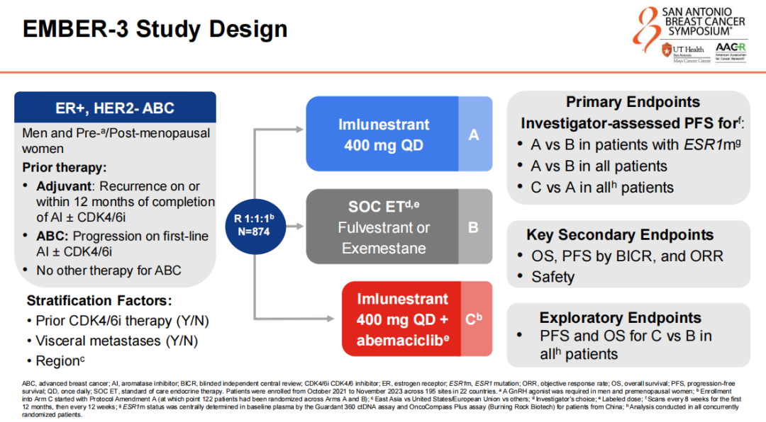 Michael Gnant教授:我认为昨天(12月11日)最令人印象深刻的是EMBER-3研究(GS1-01)的结果。该研究探索了一种新的SERD类药物Imlunestrant作为单药治疗或联合阿贝西利治疗的效果,并将其与标准内分泌单药治疗(如氟维司群或芳香化酶抑制剂)进行了比较。这个研究特别有趣,因为它涉及到SERD(选择性雌激素受体降解剂)这一药物治疗领域,Imlunestrant作为单药治疗在ESR1突变的疾病中显示出了很好的疗效。然而,在与阿贝西利联合使用时,疗效似乎与ESR1突变状态无关,这一点从科学角度来看非常有意思,并且为那些可能无法进行分子检测的患者提供了一个良好的治疗选择。
