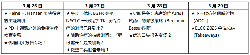 随后,Myung-Ju Ahn教授介绍了2025 ELCC四天日程的亮点(表),除此以外,患者倡导会议和青年肿瘤学家专场将贯穿会议全程,以鼓励和支持下一代肺癌专家的成长。她向参会者表达欢迎:“很自豪今年能迎来4000多名注册参会者,期待与你们共同举行富有成效的学术会议”。