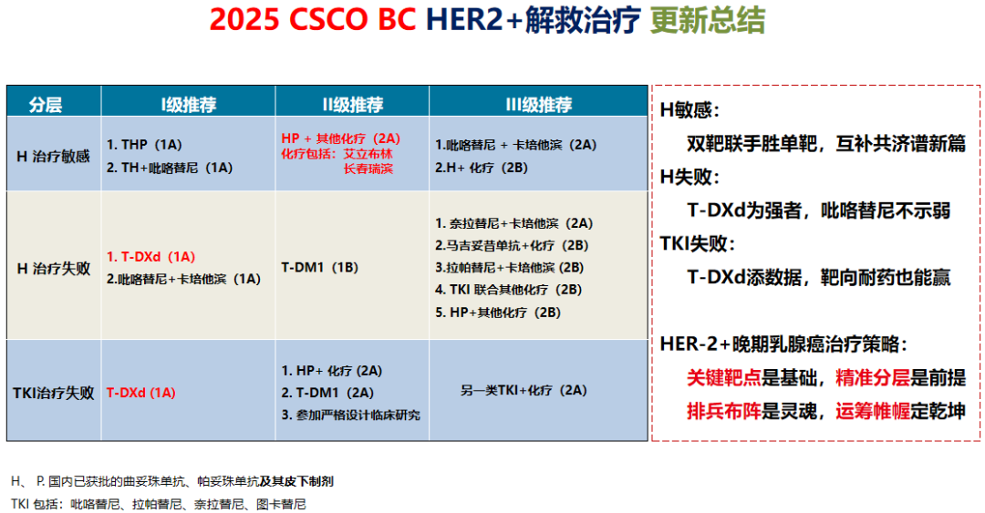 在Ⅱ级推荐方面,2024年指南中T-DM1为1A类证据,2025年《CSCO BC指南》将其调整为1B类证据,这体现了在治疗过程中,可优先选择T-DXd以及国产原研的吡咯替尼联合卡培他滨方案,T-DM1依然是次选。