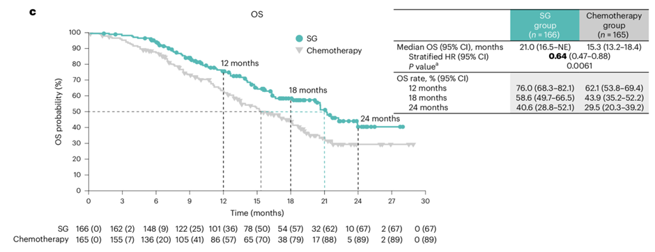 EVER-132-002研究[13]是徐兵河院士领衔的Ⅲ期、多中心、随机对照研究,针对亚洲人群,70%来自中国大陆。研究要求患者既往接受过2-4次系统性化疗,不限制既往CDK4/6i的应用,其中49%的患者为CDK4/6i经治。该研究按1:1随机分组后分别予以SG或TPC治疗。SG组较TPC组明显改善了盲法独立中心评审委员会(BICR)评估的mPFS(HR,0.67;95%CI 0.52-0.87;P=0.0028),6个月、9个月和12个月PFS率方面均提升近2倍;mOS为21.0个月vs.15.3个月,HR为0.64(95%CI 0.47-0.88;),P=0.0061,降低了36%的死亡风险(图3),再次印证了PFS和OS双重获益。