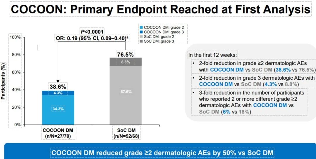 COCOON研究评估了预防性皮肤病治疗(口服多西环素或米诺环素12周,随后头皮涂抹克林霉素乳液;指甲涂抹氯己定手液;身体和面部涂抹神经酰胺保湿霜)与标准治疗相比,能否改善埃万妥单抗+兰泽替尼的皮肤毒性。在中位随访期约4个月早期时间点进行的首次中期分析中,预防性方案带来获益,前12周≥2级皮肤不良事件(AE)(76.5%vs.38.6%)和3级皮肤AE(8.8%vs.4.3%)发生率仅为标准治疗组的50%,因不良事件导致的停药率降低了50%。