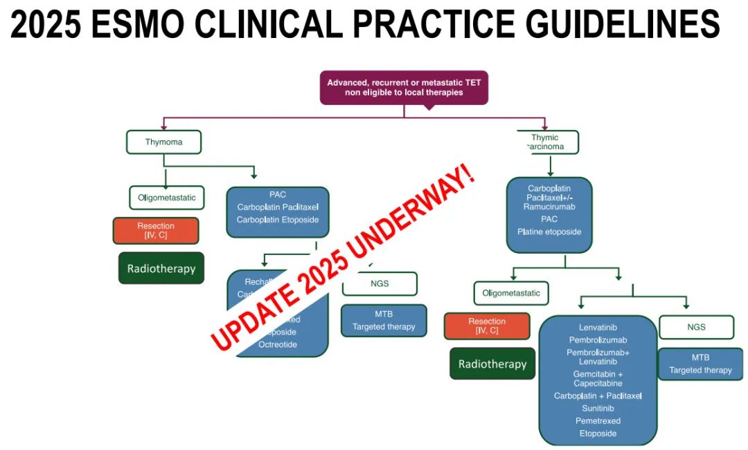 Dr.Girard:晚期或转移性胸腺上皮肿瘤领域近期取得多项进展。在一线治疗中,除了历史悠久的细胞毒性化疗外,一些临床试验探索了新方案,例如化疗(卡铂-紫杉醇)联合抗血管生成药物(包括雷莫芦单抗和贝伐珠单抗)。近期研究显示,化疗联合抗血管生成药物的三联方案(卡铂+紫杉醇+雷莫芦单抗)可显著延长无进展生存期(相比传统化疗的数据),可能成为这类患者的优选方案。当前治疗模式正从单纯化疗向“化疗+抗血管生成药物±免疫疗法”转变。
