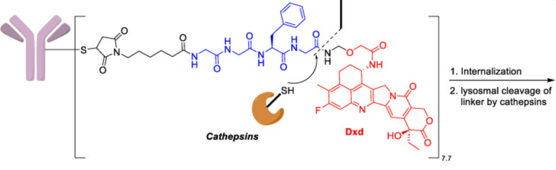 图2.T-DXd的药物结构:蓝色部分为四肽连接子;红色部分为载荷DXd