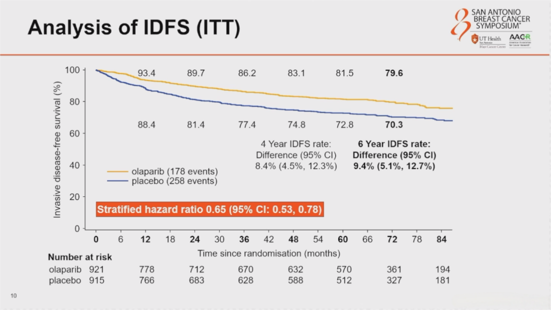 免疫治疗、HER2靶向治疗、CDK4/6抑制剂(用于激素受体<hr/>阳性乳腺癌)和PARP抑制剂(用于BRCA突变型乳腺癌)等新型治疗方法在年轻患者中的疗效可能与老年患者相当。然而,临床试验通常纳入的年轻患者数量相对较少,因此,很难在这一亚组中获得相关临床证据。一个例外是对于高风险、HER2阴性早期乳腺癌且携带BRCA1/2胚系突变患者开展的的III期OlympiA试验(NCT02032823);该研究将900多名中位年龄为42岁的患者随机分组,在完成标准治疗后接受奥拉帕利辅助治疗。研究结果显示,与安慰剂组相比,服用奥拉帕利1年后,患者IDFS和DDFS显著延长(N Engl J Med.2021;384:2394–2405)。值得注意的是,这一生存获益在6年后仍持续存在,且未增加继发性骨髓增生异常综合征或急性髓系白血病的风险(SABCS 2024;SESS-1568)。