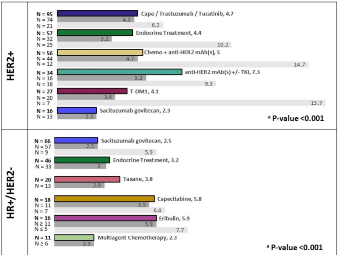最常使用的一线治疗方案是曲妥珠单抗+图卡替尼+卡培他滨(58%)和曲妥珠单抗联合化疗(15.8%),中位至治疗失败时间(TTF)分别为3.7个月和2.8个月;