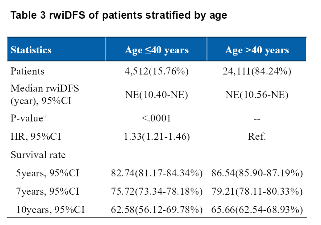 在这项真实世界研究中,观察到年轻的HR+/HER2-早期乳腺癌患者预后较差。并且年轻(≤40岁)是一个重要的独立风险因素,与HR+/HER2-早期乳腺癌患者复发或死亡风险显著升高相关。