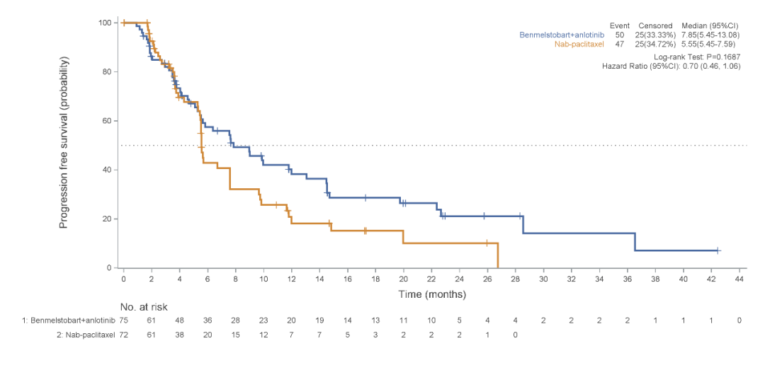 研究结果:本研究共147例患者完成随机分组,其中75例受试者接受贝莫苏拜单抗联合安罗替尼治疗(联合治疗组),72例接受白蛋白紫杉醇(对照组)治疗。在意向治疗分析中,研究者评估的中位PFS在联合治疗组为7.85个月,而对照组为5.55个月(HR=0.70;95%CI:0.46~1.06;P=0.1687)(图2)。