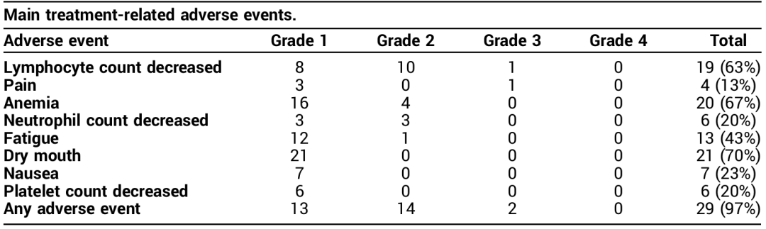 最常见的治疗相关不良事件为1级口干(59%)、1级疲劳(55%)、1级恶心(48%)和1级骨髓毒性(24%-30%),这些不良事件通常在随访期间恢复正常。≥2级不良事件很少发生(<15%),且无临床相关性。