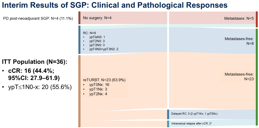 截至目前披露的数据,共纳入40例患者,其中36例进入疗效评估人群。结果显示,16例(44.4%,95%CI:27.9–61.9)患者达到cCR,达到研究预设的第一阶段目标(cCR例数≥7)。所有实现cCR的患者均接受了re-TURBT替代根治性膀胱切除术,并继续接受术后帕博利珠单抗治疗,体现了该方案在部分患者中实现保膀胱治疗的可行性。此外,队列中病理缓解率(ypT≤1N0-x)为55.6%,提示SG+P方案在整体人群中具有较好的抗肿瘤活性。
