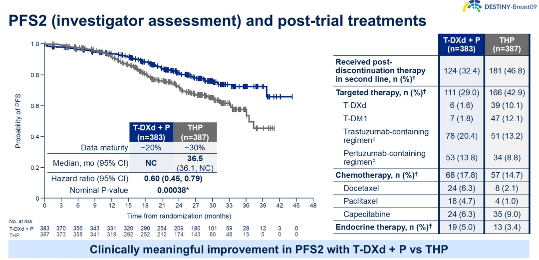 OS尚未成熟(成熟度16%),目前已显示有一定的获益趋势(HR 0.84)。在后线抗HER2治疗非常丰富的情况下,OS阳性结果难度较大,目前多数此类研究中OS并非主要终点。但从此次报道的PFS2结果来看,T-DXd+P组和THP组分别为未达到36.5个月,风险显著降低40%(HR 0.60,95%CI:0.45~0.79,P=0.00038)。