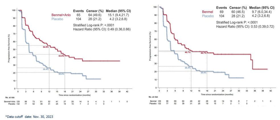 IRC评估的中位PFS(mPFS):联合治疗组为15.1个月(95%CI:9.4~21.7),显著优于安慰剂组的4.2个月,HR 0.49(95%CI:0.36~0.66,P<0.0001);单药治疗组mPFS为9.7个月(95%CI:6.0~34.4),同样显著优于安慰剂组,HR 0.53(95%CI:0.39~0.72;Log-rank P<0.0001)。