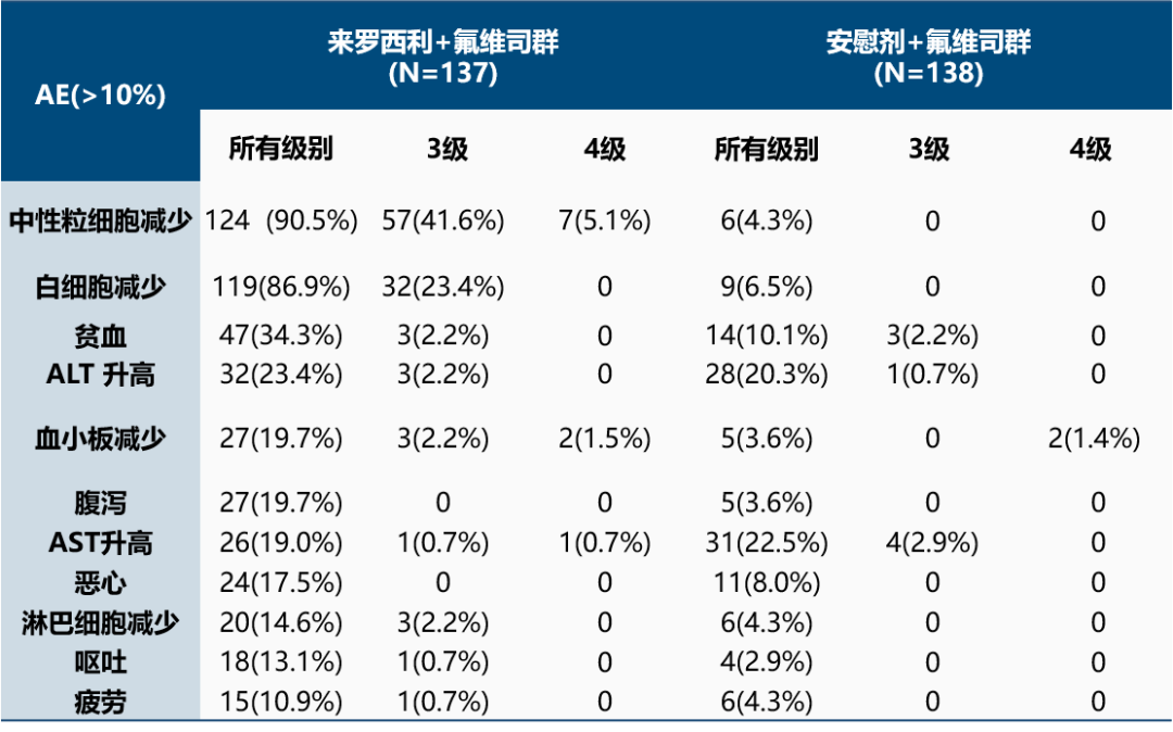 在安全性方面,LEONARDA-1研究显示,来罗西利组≥3级不良事件发生率为57.7%,中性粒细胞减少的副作用更可控,4级比例仅5.1%,避免了因中性粒细胞减少症导致的治疗假期;胃肠道毒性低,腹泻发生率仅19.7%,无3级及以上腹泻,极大提高了患者长期治疗的依从性,无VTE等临床后果严重的不良反应发生;与安慰剂组相比,未增加肝毒性、Q-T间期延长、间质性肺病(ILD)、皮疹等风险,显著提升患者生存质量。严重不良事件发生率为5.8%。因此,在临床应用来罗西利时,最主要注重的是血液毒性的预防和对症处理,其整体安全性可控,且在安全性监测方面,来罗西利无需特殊关注及监测VTE、肺部ILD、Q-T间期延长、肝毒性等风险,临床应用更加安心。在耐受性方面,LEONARDA-1研究因治疗相关不良事件导致停药的发生率仅为0.7%,LEONARDA-2研究未见因治疗相关不良事件导致的停药,提升了患者耐受性。
