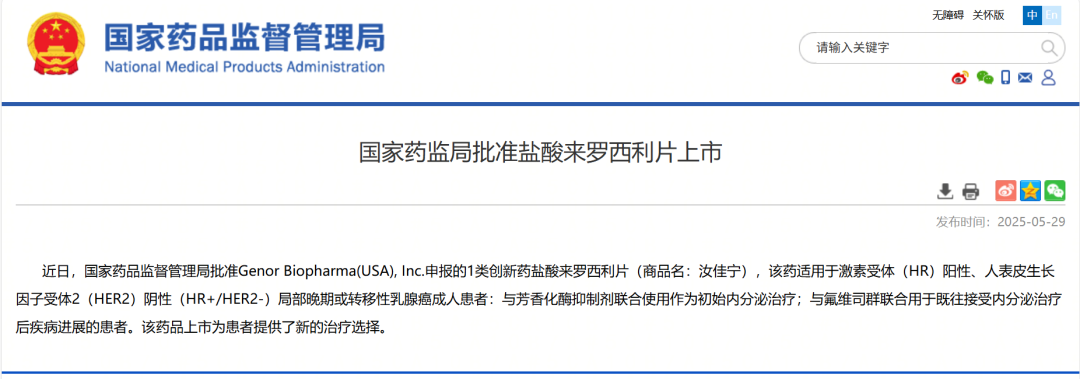 NMPA批准来罗西利上市