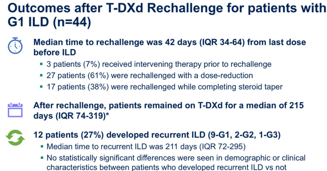 今年ASCO年会上,一项关于T-DXd相关间质性肺炎的临床研究也引起了广泛关注(摘要号:1015)。该研究探讨了治疗过程中出现1级ILD的患者,是否可以再次使用T-DXd进行治疗。研究收集了从2017-2024年美国多家中心的1400余名患者数据,其中44例出现1级ILD的患者再次使用T-DXd进行治疗,研究结果显示,1级ILD患者再使用T-DXd进行治疗是安全的,不同真实世界人群的患者能从T-DXd中持续获得临床获益。