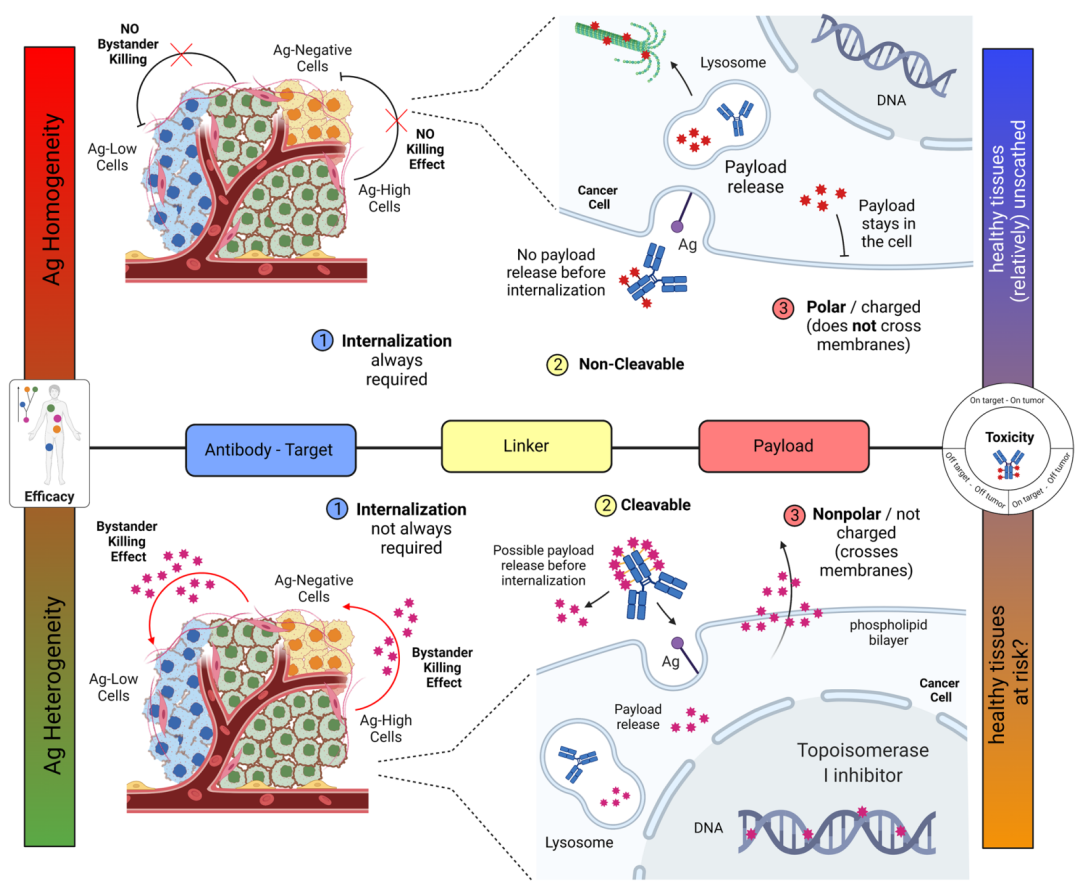 载荷的化学特性同样至关重要。疏水性强、非极性的载荷,如deruxtecan衍生物DXd、单甲基奥瑞他汀E(MMAE)更容易穿过细胞膜产生旁观者杀伤。相反,极性或带电荷的载荷(如T-DM1中的DM1)则难以扩散到邻近细胞。