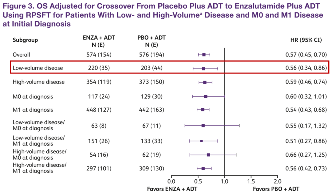 此外,从临床相关的亚组分析来看[9],无论是高瘤负荷患者(HR 0.70)还是低瘤负荷患者(HR 0.71),亦或是既往接受过多西他赛治疗的患者(HR 0.67),以及未接受过多西他赛治疗的患者(HR:0.71),各亚组均呈现出阳性结果,即均能从恩扎卢胺治疗方案中获益。这一结果与既往分析结果一致,进一步支持恩扎卢胺联合ADT方案一线治疗mHSPC。