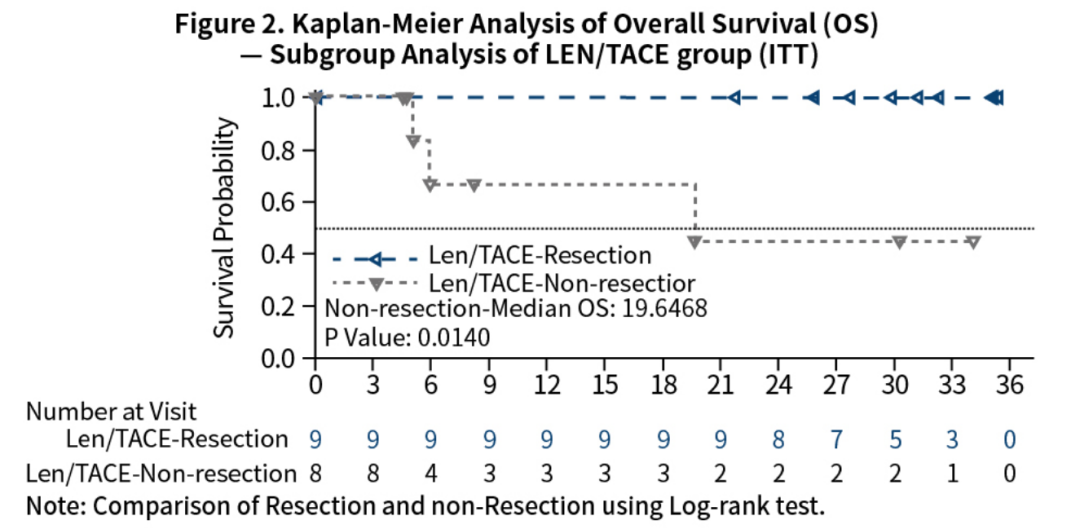 △LEN/TACE组中,已切除患者的OS显著长于未切除患者(NR vs 19.6个月,P=0.0140)(图源:原文壁报)