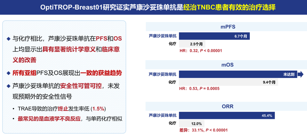 杨谨教授:作为我国自主研发的TROP2 ADC,芦康沙妥珠单抗凭借新颖的药物设计和良好的临床研究表现,已成为国产TROP2 ADC的领头羊。首先请回顾一下芦康沙妥珠单抗在晚期TNBC治疗中的研究进展和最新疗效数据,并讨论它当前和未来的临床价值。