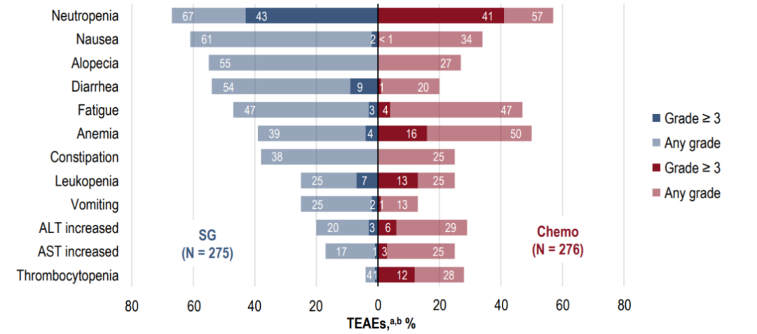 在安全性方面,SG组中位治疗时间8.3个月,TPC中位治疗时间约6个月,SG组≥3级常见不良事件为中性粒细胞减少、腹泻,未见新的不良事件信号。SG组耐受性较对照组更好,治疗期间不良事件(TEAE)导致的治疗减量比例为37%vs 45%,TEAE导致的治疗终止比例为4%vs 12%。由此可见,SG可控的安全性和良好的耐受性为患者如期按量接受治疗、争取最大获益奠定了基础。