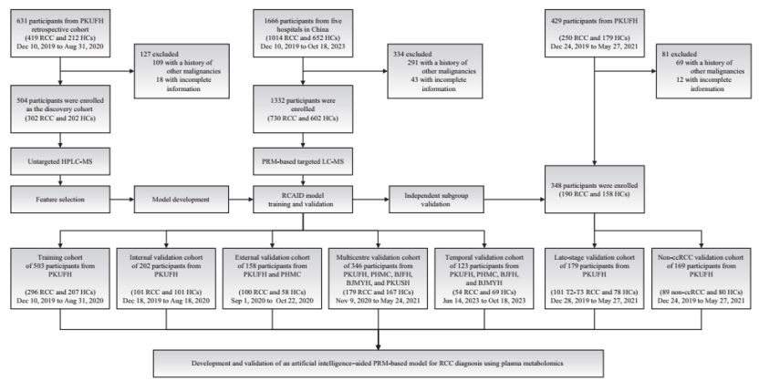 编者按:早期诊断对于提高肾细胞癌(RCC)的生存率至关重要;然而,有效的实验室检测方法仍然缺乏。近期,北京大学第一医院泌尿外科周利群/李学松/何世明教授团队与北京大学基础医学院尹玉新/王光熙团队合作,通过表征RCC中的代谢重编程,开发了一个人工智能(AI)联合代谢组学、多组学联合分析技术的血浆代谢模型,其能够有效检测发现肾癌;相关研究成果已经发表于国际泌尿外科顶级期刊European Urology(IF=25.2)。对于泌尿肿瘤科医生而言,该研究提供了一种有潜力的微创诊断工具,可以补充影像学检查,改善早期肾细胞癌的检测,并可能改进患者的治疗策略。