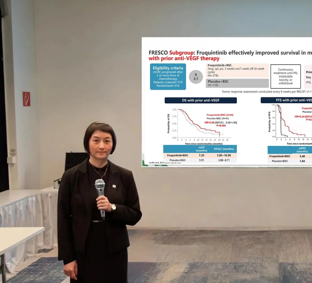 在随后的讨论环节,上海交通大学医学院附属瑞金医院季晓频教授从外科视角出发,指出在VEGFi用于RAS突变型mCRC的转化治疗探索中,此前贝伐珠单抗虽可提高转化切除率,但也会使术后并发症发生率上升,而使用呋喹替尼作为转化治疗可能更为安全,且停药周期更短,一至二周即可,助力患者获得更长期的无进展生存获益。而作为MSS型肠癌患者免疫联合治疗的组成部分,呋喹替尼也已有一些早期研究报告积极结果。Eng教授补充指出,呋喹替尼剂量调整更为灵活,更适合与化疗及免疫治疗联合使用。