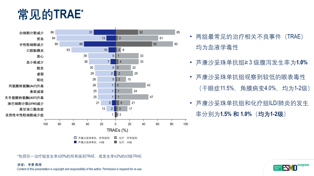 安全性方面,芦康沙妥珠单抗的安全性特征与既往研究一致,研究中未发现新的安全性信号,两组≥3级治疗相关不良事件(TRAE)发生率分别为62.0%和64.8%,最常见的TRAE均为血液学毒性;芦康沙妥珠单抗组常见的非血液学TRAE为口腔黏膜炎,主要为1-2级,ILD/肺炎发生率仅为1.5%,且未发生导致治疗终止的TRAE或治疗相关死亡,整体毒性可管可控。综上所述,芦康沙妥珠单抗在OptiTROP-Breast02研究中交出了出色答卷,不仅与既往同类TROP2 ADC的临床研究结果一致,还有望更好地延长患者总体生存,从而进一步改写CDK4/6抑制剂经治HR+/HER2-晚期乳腺癌的治疗格局,为我国患者提供更多高效、安全且可及性可能更好的全新治疗选择。