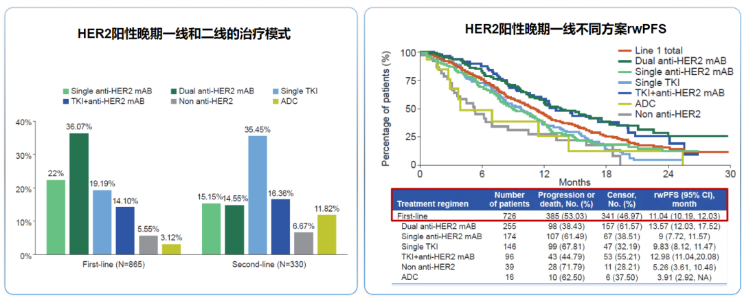 以我国学者2025年发表的一项真实世界分析为例,研究收集了2020-2022年5家中心865例HER2阳性不可切除或转移性乳腺癌患者的治疗模式和临床结局资料,其中一线治疗常用方案依次为HP双靶方案(36.07%)、曲妥珠单抗单靶治疗(22%)和曲妥珠单抗+TKI方案(19.9%),双靶方案应用比例明显低于国外真实世界数据;治疗模式不均一和患者特征差异,也影响了真实世界PFS(rwPFS)数据,全部患者的一线治疗rwPFS仅为11.04个月[6]。