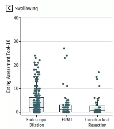 ③ 在长期发声功能方面,其结果不同于呼吸改善的情况,CTR组患者的发声功能为最差。术后12个月时,其VIH-10评分依次为10(ED)vs. 3.5(ERMT)vs. 13(CTR),通过比较分析发现,ERMT组患者的长期发声功显著优于CTR及ED组(P<0.05),但CTR与ED组并无显著差异(详见图2)。此外,在吞咽功能方面,三组患者均未出现显著的吞咽功能损害(详见图3)。