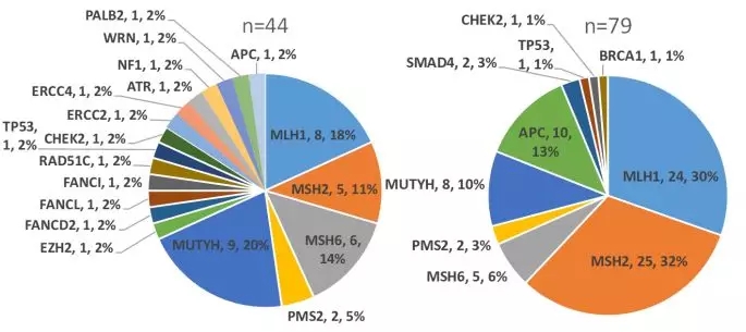 初步印象表明,中国人群MUTYH、MLH1、MSH6、MSH2突变较多,美国人群以MSH2、MLH1、APC突变为主。中国早发胚系突变基因分布图(32例北肿+12例燃石临检,总计44例患者,突变率44/449=9.8%,Lynch 4.7%);美国密歇根大学综合癌症中心单中心数据(79/315=25.1%,Lynch 17.8%),见图3。