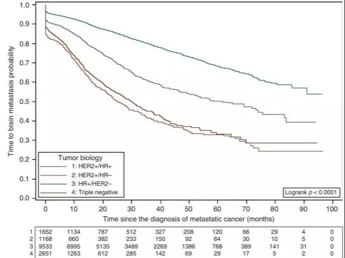 图1.不同亚型患者的CNS无转移生存