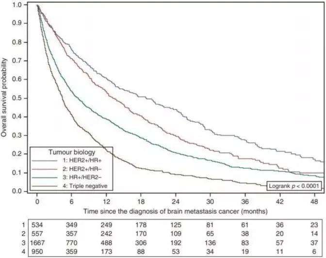 诊断为CNS转移的中位年龄为58.1岁(22.8~92.0岁)。在发生CNS转移的患者中,中位CNS无转移生存为10.8个月(95%CI 16.5~17.9个月)。分子亚型与CNS无转移生存独立相关(TNBC和HER2-/HR+患者:HR=3.45,95%CI 3.13~3.75)。
