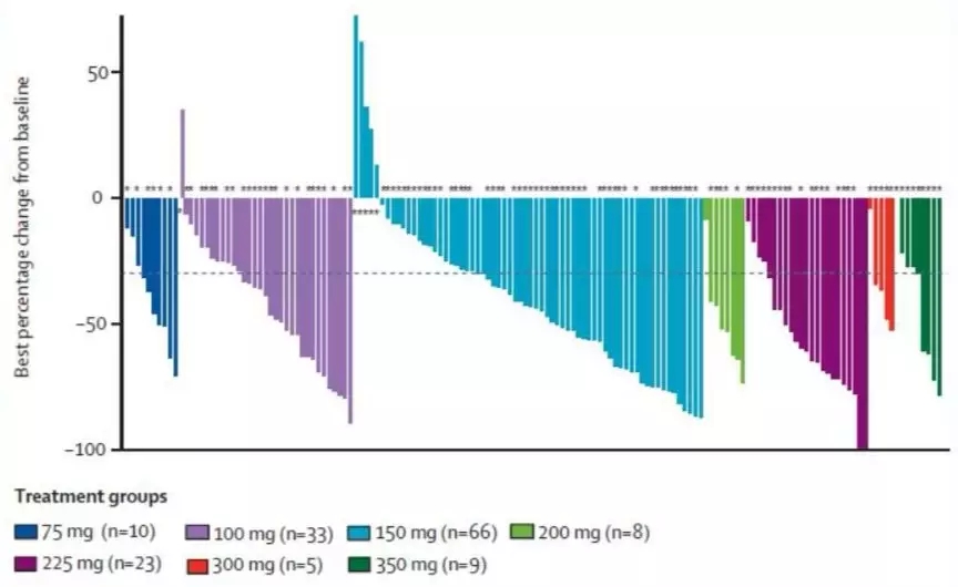 患者血药浓度的中位达峰时间为2.5~6.1小时(图2)。不同治疗组的半衰期相似,不依赖于治疗剂量的变化而变化。共计6例患者记录到剂量限制性毒性,2例在150 mg组,1例在225 mg组,3例350 mg组。