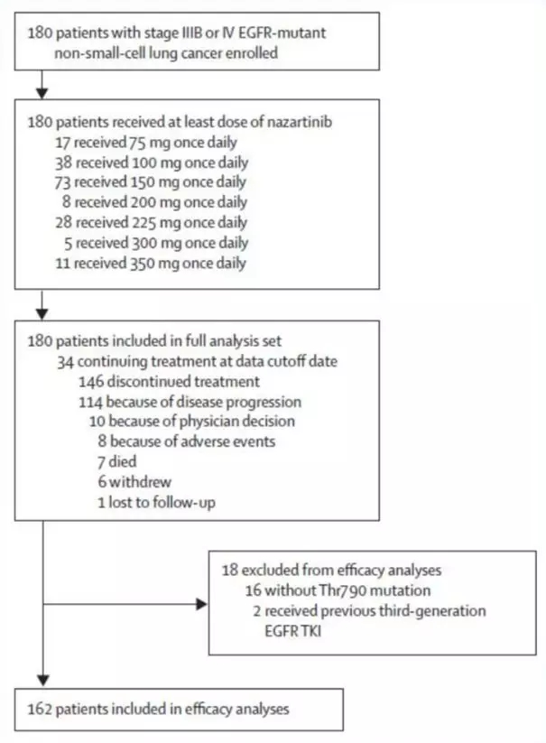研究共入组180例患者(图1),所有患者均至少接受了1周期的Nazartinib的治疗,不同剂量组具体如下:75 mg (n=17),100 mg (n=38),150 mg (n=73),200 mg (n=8),225 mg (n=28),300 mg (n=5)和350 mg (n=11)。数据截止时,81%的患者终止治疗。