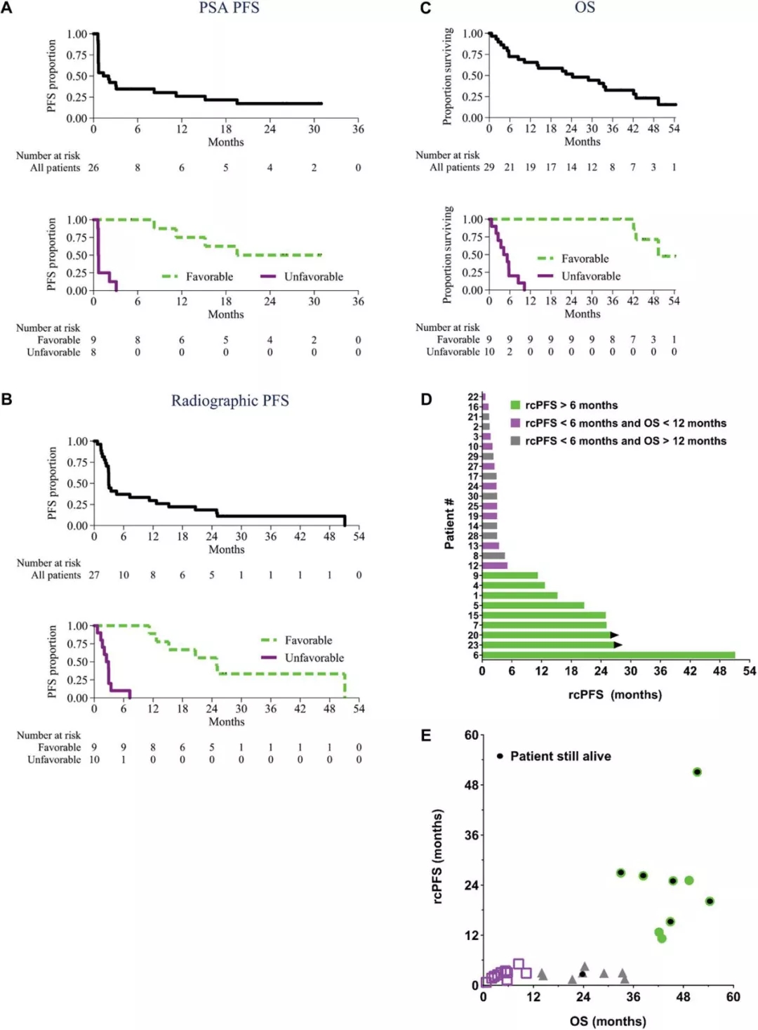 该组中位PSA-PFS为1.7个月,中位影像学PFS为3.0个月,中位OS为24.3个月。最佳的影像学反应是病情稳定,治疗后疾病控制率为37%。