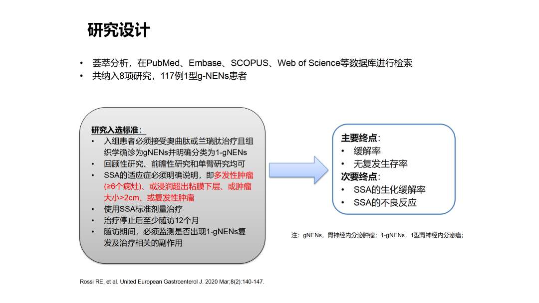 胃神经内分泌肿瘤是消化系统神经内分泌肿瘤常见类型,其中以1型胃神经内分泌肿瘤(1型g-NENs)最为常见。尽管生物学行为相对惰性,但临床上极易复发,如何治疗和预防复发是1型g-NENs的治疗上的难点与痛点。近期United European Gastroenterol J(IF=3.453)发表了一篇关于生长抑素类似物(SSA)用于1型g-NENs的系统综述和meta分析文章,我们特邀中国医学科学院肿瘤医院王贵齐教授和刘勇博士进行深入点评。从中我们可以初步看到,长效SSA用于病变复发、多发或不能通过内镜有效管理和切除的1型g-NENs,可以有效的缩小肿瘤、预防复发,同时,安全和耐受性好。