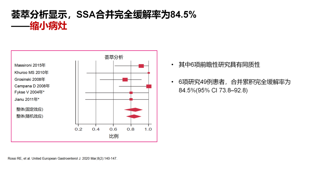 该研究采用相关关键词进行计算机文献检索,识别过去15年中发表的所有相关文献。最终纳入8项涉及SSA治疗1型g-NENs的研究。该研究发现,SSA治疗1型g-NENs的完全缓解率约为25-100%。当只考虑其中6项前瞻性研究时,各研究间无显著异质性,患者累积完全缓解率高达84.5%(置信区间73.8-92.8)。其中3项研究评估了1型g-NENs在使用SSA 12个月,停药后的复发情况,中位随访34个月后,累积复发率为30.2%(置信区间13.1-50.6)。