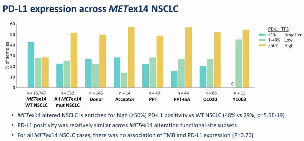 然而,MET 14外显子跳跃突变NSCLC的PD-L1高表达(≥50%)比例高于野生型,分别为48% vs. 29%(p=5.5E-19),PD-L1阳性率在MET 14外显子突变的各功能位点亚组的分布情况相似。在所有MET 14外显子跳跃突变NSCLC病例中,TMB和PD-L1表达没有相关性(P=0.76)。