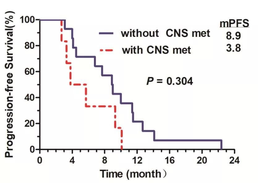 多因素分析发现,患者性别、年龄、PS评分、疾病分期、驱动基因突变状态与患者PFS无关,但基线存在中枢神经系统转移的患者OS更差(HR=0.264, 95% CI: 0.075-0.931,P=0.038);有EGFR经典突变和无经典突变患者的中位PFS分别为9.0个月和7.7个月(P=0.580),初治和继往经TKI治疗的患者,中位PFS分别为5.7个月和8.9个月(P=0.433)。基线有中枢神经系统转移和无中枢神经系统转移患者的中位PFS分别为3.8个月和8.9个月(P=0.304)(图4)。