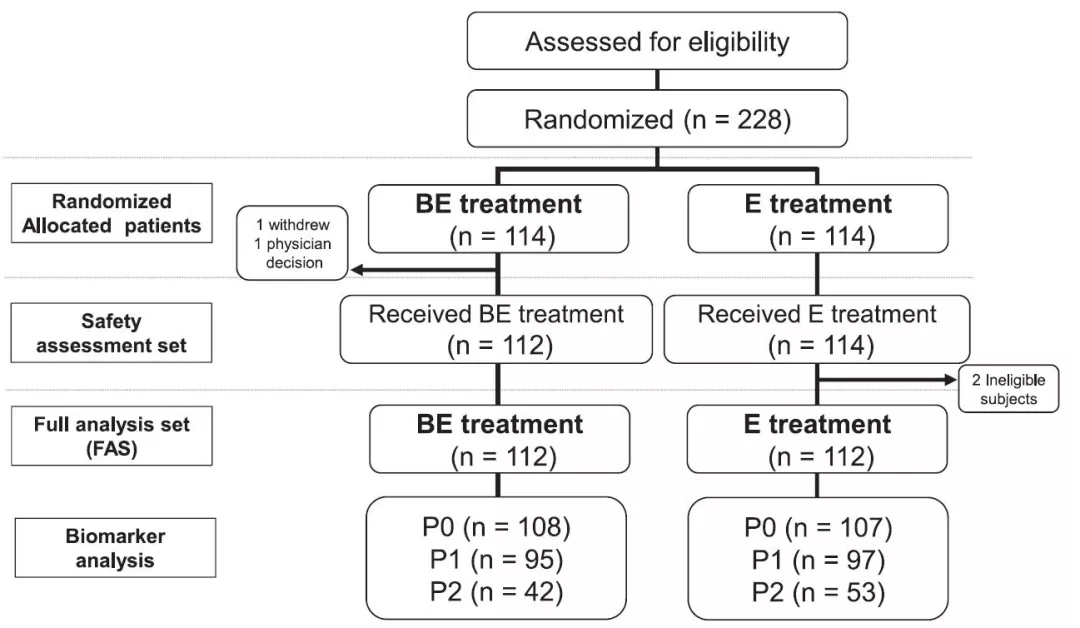 NEJ026研究共纳入228例患者,符合入组标准的患者按照1:1的比例接受随机化,联合治疗组和单药治疗组均有114例患者,最终,分别有112例和114例患者接受相应治疗(图1)。