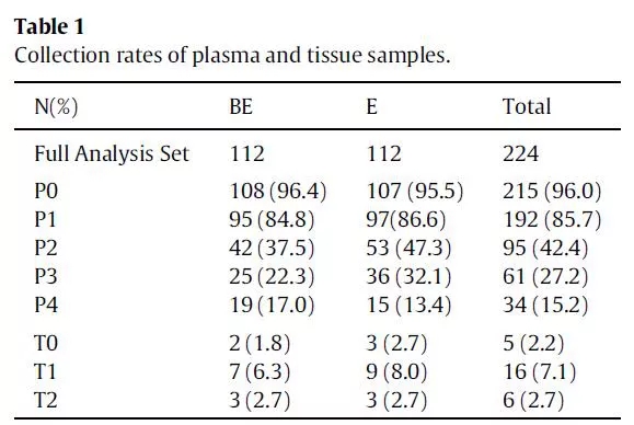 联合治疗组和单药治疗组在P0阶段样本收集率分别为96.4%和95.5%,P1阶段分别为84.8%和86.6%,P2阶段为37.5%和47.3%,P3阶段为22.3%和32.1%,P4阶段分别为17.0%和13.4%(图2)。