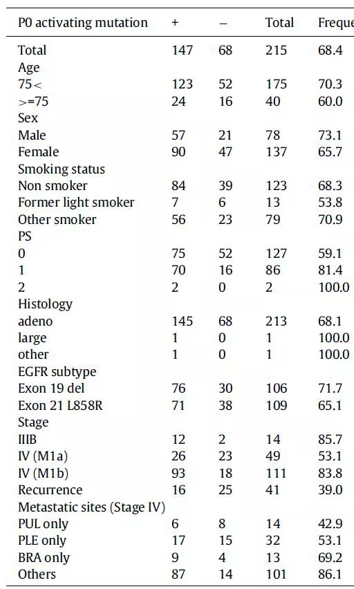 在P0阶段,有68.4%的患者基于外周血检测到EGFR基因突变。性别、年龄、吸烟状态、组织病理学、EGFR突变类型与患者的检测阳性率无关,但PS评分为1分、M1a的患者,EGFR的检出率较低。此外,仅存在肺转移、胸膜转移或脑转移的患者,EGFR检出率同样较低(图3)。