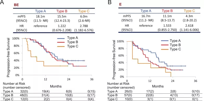A类患者具有最长的PFS,但是单药组和联合组之间不存在显著性差异;C类患者PFS最短,单药组和联合组同样不存在统计学差异;而在B类患者中,联合治疗组显示了更好的PFS。
